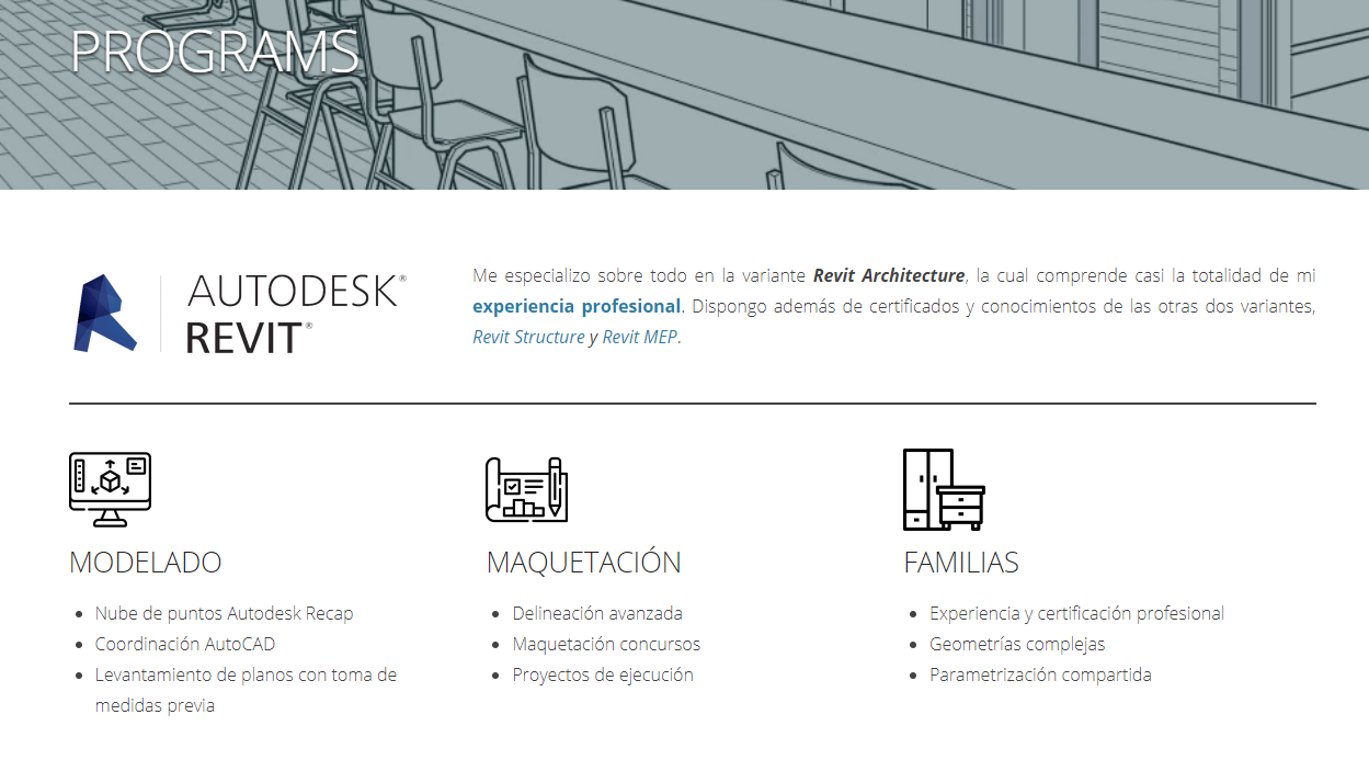 In addition, I have optimized the way in which the information about it is expressed. For example, before there were 3 subcategories of curriculum: BIM CERTIFICATIONS, PROGRAMS and EXPERIENCE. On the main page, a small biography was displayed, and the curriculum itself was accessed through the upper menus. The initial objective was to provide the information that was considered most important from the home page and prioritize a cover letter to everyone who accessed.