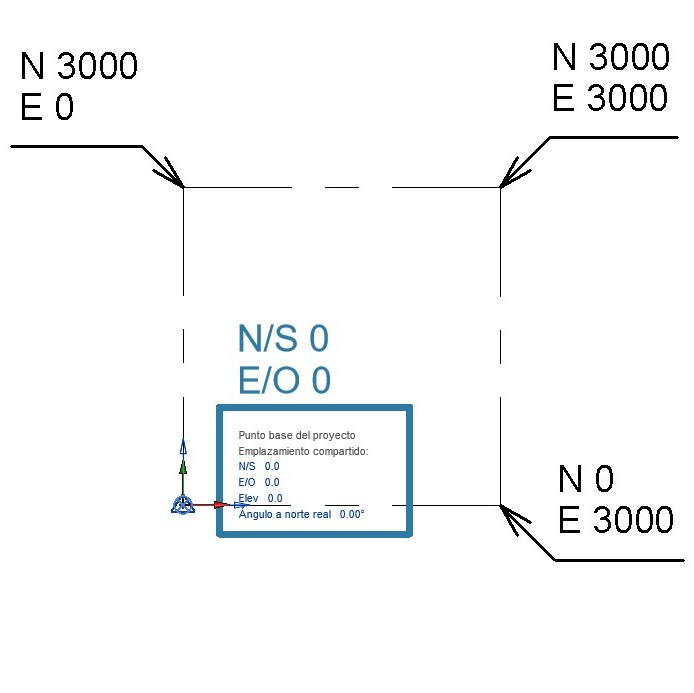 Nota: Es recomendable tener este punto ubicado en algún lugar conocido y medible del proyecto. Normalmente suele asignarse a un punto topográfico de la parcela del proyecto dado por el técnico responsable. Esto nos permite comprobar rápidamente entre diferentes edificios de un mismo proyecto si todos tienen asignado el mismo SP, y por tanto si todos están ubicados geográficamente de forma correcta.